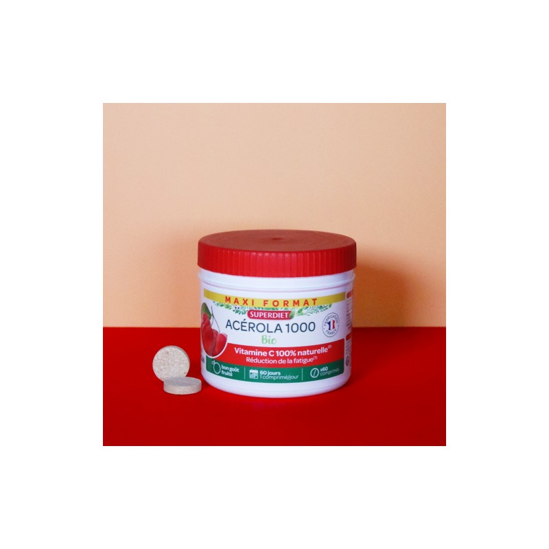 Naturellement riche en Vitamine C, l'Acérola Bio Superdiet assure sa biodisponibilité pour l'organisme : 1 comprimé par jour vous apporte 170 mg de Vitamine C soit 212% de vos besoins quotidiens !