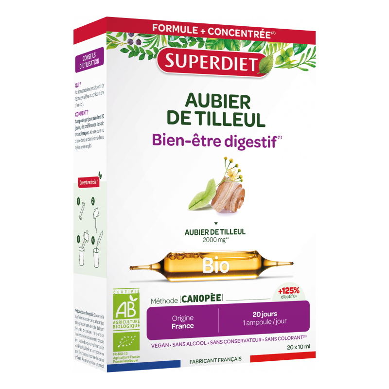 Descriptif : L'aubier de tilleul favorise la digestion L'aubier de tilleul est reconnu pour ses bienfaits sur la digestion. Les extraits fluides et Purs jus SUPER DIET sont fabriqués dans les ateliers de notre laboratoire selon nos méthodes d'extractions, éprouvées depuis plus de 25 ans. - l'nfusion - décoction : en utilisant la complémentarité de ces deux méthodes d'extraction et en adaptant un protocole particulier à chaque extrait fluide, nos chercheurs optimisent les paramétres de facrication. Nos extraits fluides sont fabriqués dans nos ateliers sans alcool, ni conservateur, ni colorant. - l'extraction à froid : cette pression mécanique à froid nous permet d'obtenir un Pur jus.